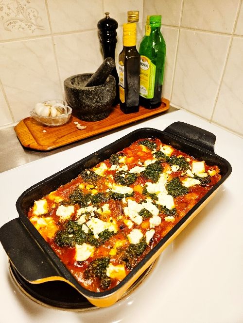 Bakade bönor med bacon, tomatsås, lök, vitlök, chili, spenat