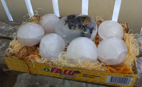 Isägg. Gjorda i ballonger. Det handlade alltså både om teknik och naturvetenskap. Det stora ägget har jag gjort. Och för att få det lite mer annorlunda än bara till storleken knölade jag in lite svart silkespapper och glitter i ballongen innan jag frös den.