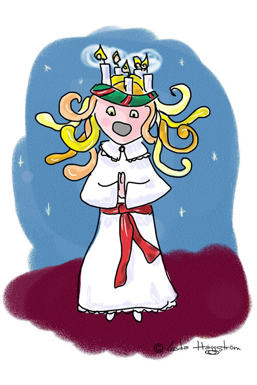 Vänta! Nu tror jag att jag vet… det är ju Luciadagen idag. Då måste det ju vara Lucia som kommer där borta. Sankta Lucia. Åh vad glad jag blir. Och oj vad jag längtar till julen…