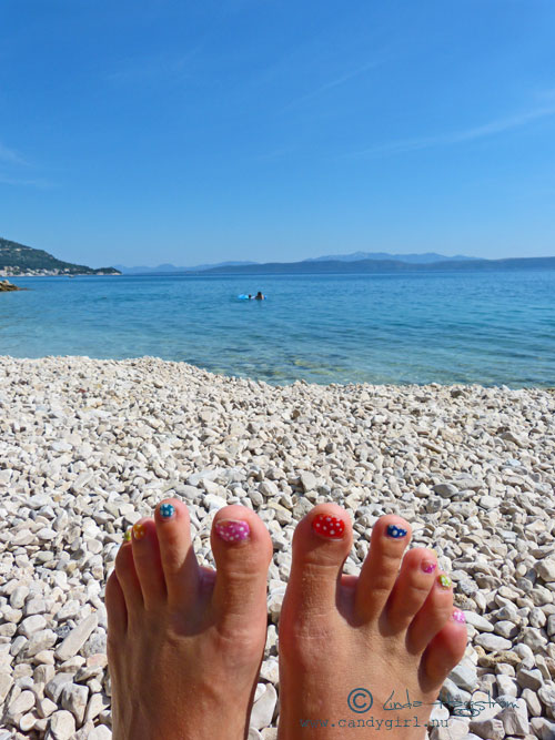 Stenarna på stranden var heta, luften stod still och vattnet var väldigt varmt. Provade fota under vattnet med kameran jag lånat av makens morbror. Det gick inte att se vad jag fotade så man fick trycka av på känn och hoppas att nåt skulle bli bra. (och eftersom jag inte har någon kabel för att föra över fotona från undervattenskameran till datorn, och minneskortet inte passar i kortläsaren, så kan jag ännu inte kika på hur dessa bilder har blivit – och med andra ord, inte ni heller!) EDIT: Undervattensfotona finns nu i detta inlägg!