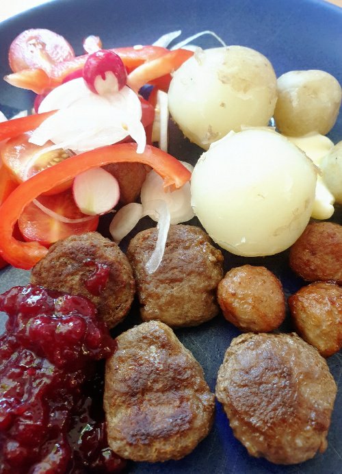 Till färskpotstisen värmde vi frysta (köpta) älgköttbullar. Enkelt. Och väldigt gott.