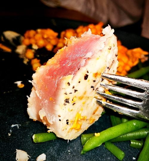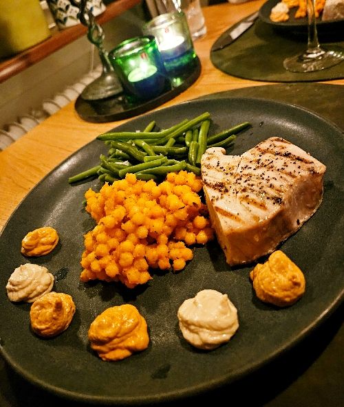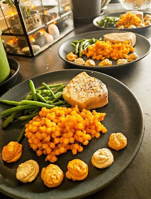 Och sen grillad tonfisk med harissakryddad pärlcouscous, haricovertes och tre sorters hummus.