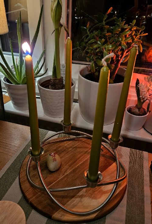 Då tänder vi änglaspelet och äter frukost med Adolf Fredriks i bakgrunden.