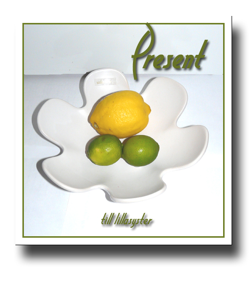 Min Lillasyster fyllde år i veckan. (hon är 3½ år yngre än mig). Och det här snygga fatet fick hon av mig…. Slog bara in i cellofan och knöt om ett snöre i samma färg som frukterna så blev det hur snyggt som helst.