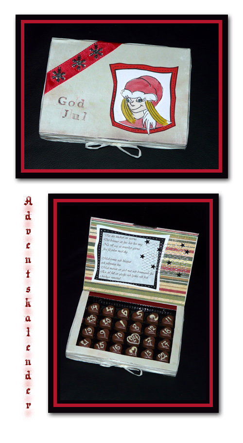 I grunden är det alltså en ask Aladdin Heart som jag gjort om lite! Och spritsat hjärtanen med vit choklad så man kan räkna ned mot julafton… Tomtenissan sitter på 3d kuddar så hon ligger ovanför ramen. Snöstjärnorna är av metall. Och texen är stämplat så där lite slarvigt.