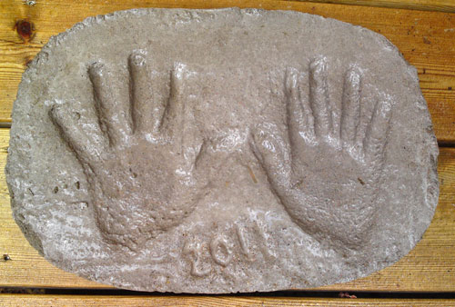 När vi under helgen som var fick igen hålet i golvet i det jättefula rummet så blev det över betong. Och då gjorde jag och bus en tavla. Vi i den bemärkelsen att jag öste/slätade ut betong i en rostfri form med gladpack i botten, bus tryckte sina händer och jag skrev dit årtal.