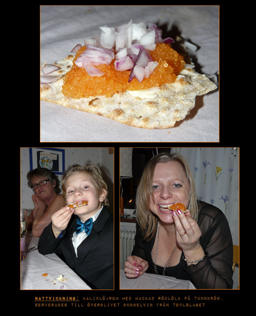 Och efter vi skjutit raketer och skickat upp en lykta (och jag sjungit den nya nyårssången) blev det vickning. Och med tanke på bostadsort är det nästan synd och skam att inte bjuda på Kalixlöjrom på tunnbröd.