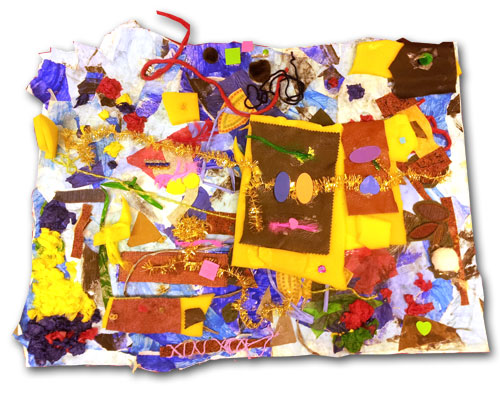 Denna gång tog vi plats på golvet. Och denna gång fick dom instruktionerna att riva sönder sin bild. I inte allt för stora bitar…. Alltså skulle man inte bara riva sönder nåt man själv skapat utan sånt som andra varit delaktiga i att göra…Dom var aningen tveksamt till en början men sen kom dom igång ordentligt. Här ovan ligger hela bilden i en plast-back.