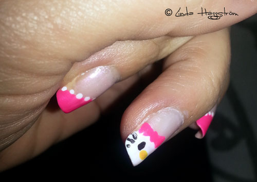 Som synes är åtta naglar målade i ljus rosa pärlemor med knall-cerise sned tipp. Duttarna i vitt gjorde jag med tandpetare. Ringfingrarna på båda händerna har samma ljusrosa pärlemor som bas men vit tipp. Och sen gjorde jag Kittys detaljer med tandpetare i svart, gul och cerise färg.
