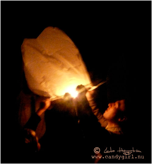 Dom som kom lagom till skålandet hade även med sig såna där rislyktor så vi skickade upp två såna innan vi sedan gick in och dukade fram Kalixlöjromen.
