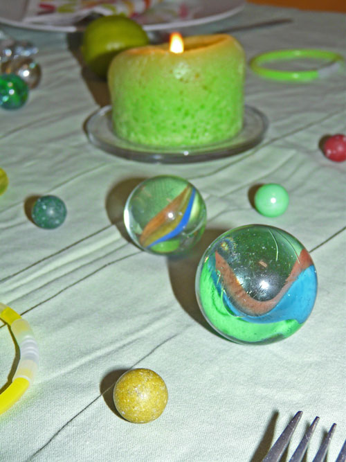 Jag utgick från servetterna jag hittade i en låda och tog ett grönt lakan, en del av busungens spelkulor, lite lime och citroner, lysstavar och ljus i rätt färger. Och vips såg det lite aftonslikt ut.