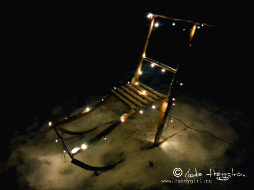 Fast den brukar stå kvar – utan att lysa – fram till april, nästan. För den är som regel rejält fastsnöad och sladden till belysningen ligger inpackad i snö som rasat från taket.