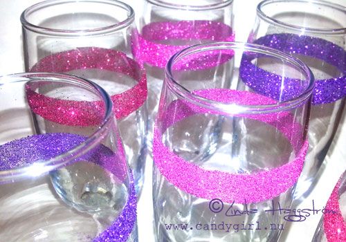 Kvällens färgtema är rosa och därför har jag självklart dekorerat glasen i samma nyanser. Här har jag bara tagit dubbelhäftande tape som jag rullat i glitter. Done! Och enkelt att diska bort sen.
