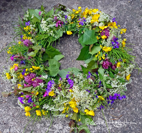 Här ovan är familjen ut-tvingad i det grymt blåsiga och kylslagna vädret som rådde under midsommaraftonen. Men det är liksom en tradition att ta ett foto med kransen och oss alla tre. Och trots det tråkiga vädret blev det ju en bra bild till nästa fotobok.