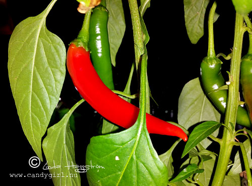 Dom hann inte bli färdiga ute i somras. Men det verkar gå fint även inne i köket. Det är en helt röd och flera som håller på rodna. 🙂 I sovrummet står en paprika. Få se om vi kan få den röd också…
