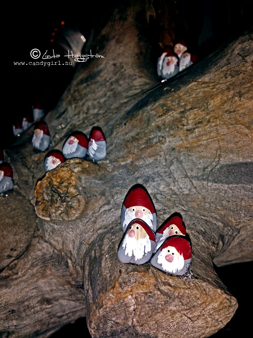 Tomtarna är målade småstenar. Och stocken har ungen dragit hem en dag i höstas. Han tyckte den var så vacker och jag höll med…och lät den bli årets pyssel.