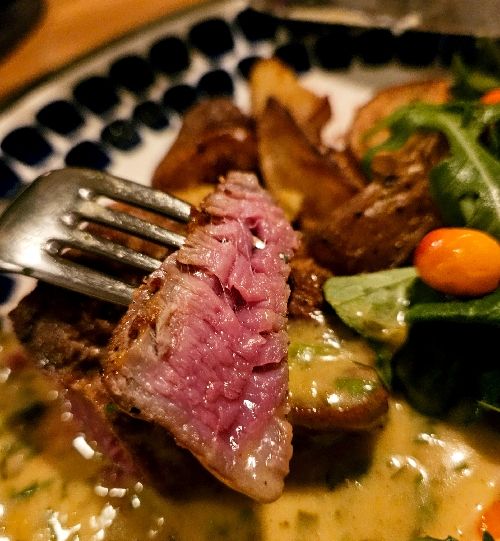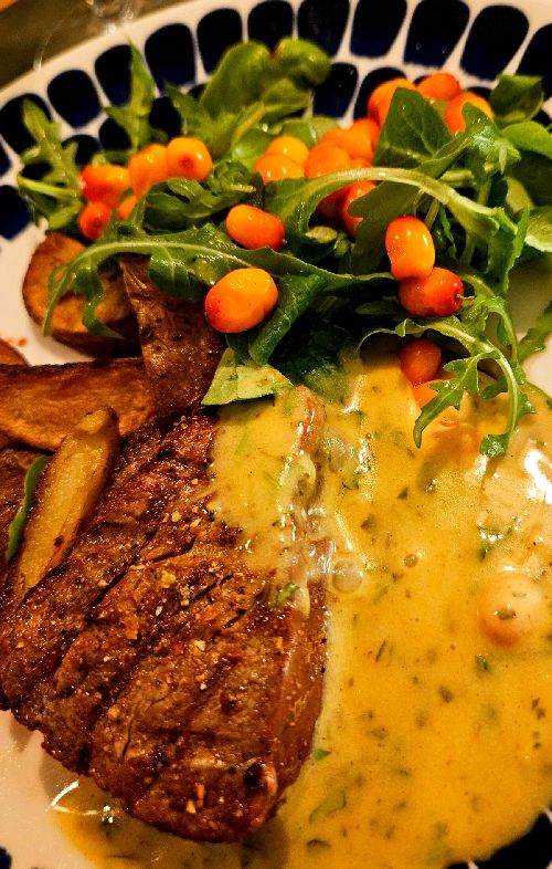 Sen blev det grillad oxfilé med rostad potatis, nyslagen bea (sista gången för säsongen jag kunde plocka in dragon från trädgården???). Och blandad sallad med havtorn.