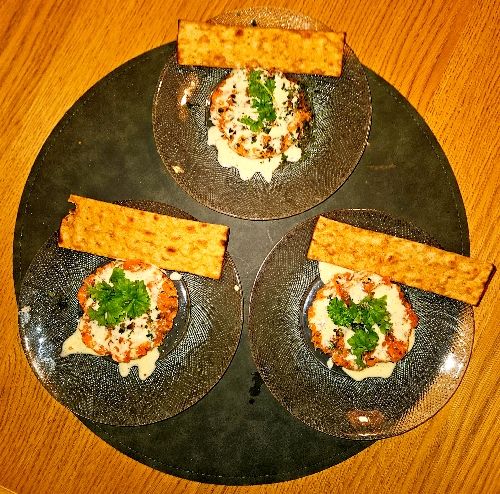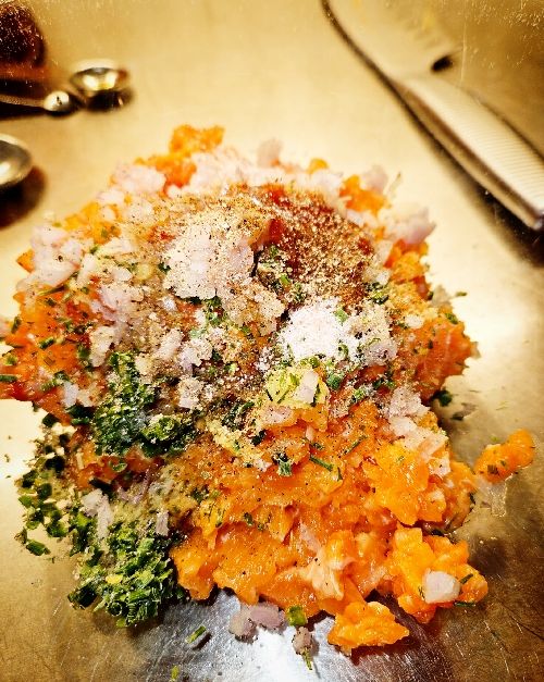 Regnbågslax, riven ingefära, sriracha, sesamolja, gräs– och charlottenlök, salt och peppar.