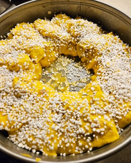 Fyllde kransen med smör, farin- och vaniljsocker.
