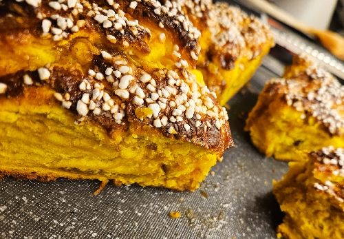 Började med att göra en saffransdeg. Med kall degvätska och kallt smör i bitar. Sen fick den jäsa i kylen medan vi tog en promenad.