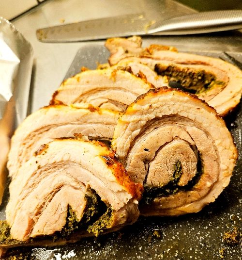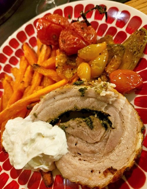 Nu satte vi in en porchetta i ugnen. Fixade tomater och paprika som också skulle ugnsstekas. Och en vitlöksyoghurt.