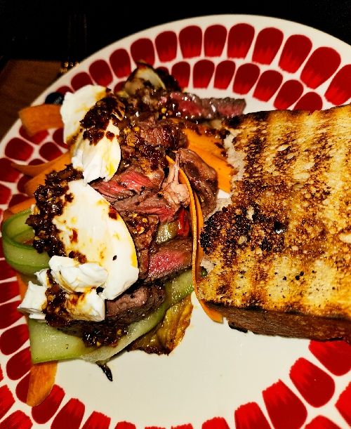 I botten ugnsrostad spetskål och parrika. Den färskhyvlade (iskrispiga) morötter och gurka. Därpå det grillade köttet. Sen mozarella och sist en chiliolja gjord av oliv- och sesamolja, vitlök och chiliflakes, soja och mangobalsamico. Grillat lantbröd som tillbehör.