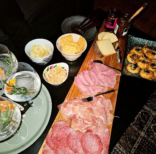 Torkade de gravade äggulorna. Gjorde en aioli och en srirachamajo. Fixade en marinad och skalade scampi för marinering i densamma. Tärnade och fräste panchetta. Kärnade ur oliver. Smaksatte en gin och frös dekor till fördrinken. Hackade nötter. Vek servetter och dukade. Och dessutom gjorde jag en pizzadeg till nyårsdagen.