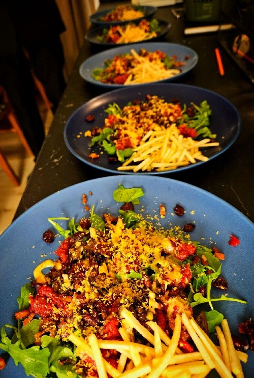 Sonen hackade kött så han blev helt slut. Och sen monterade vi en råbiff med ruccolasallad, knaperstekt panchetta, salttorkade oliver, tranbär, srirachamajo och gravad äggula.