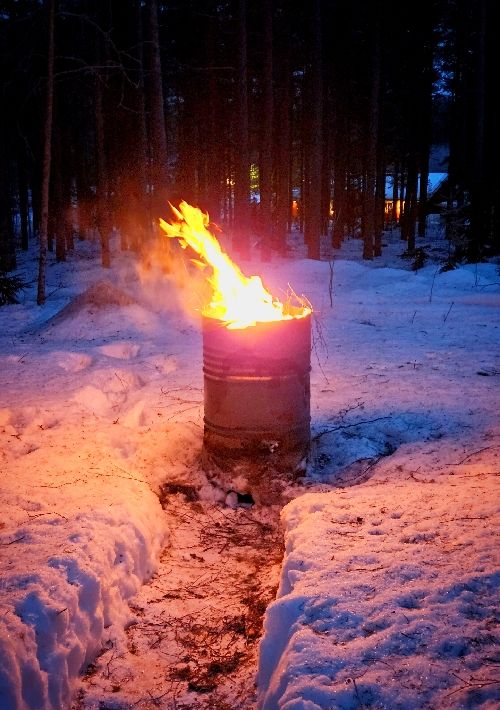 Sen städade vi gården. Allt fyrverkeriskräp, plus andra kartonger eldades upp i tunnan.