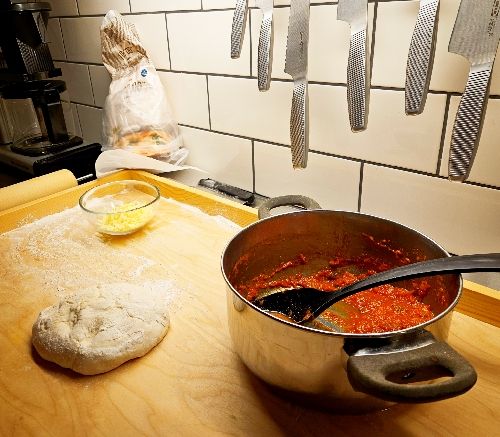 1 januari är ju förnippad med pizza. Så därför hade jag gjort en deg dagen innan. Drygt 24 timmars jäsning i kylen och sen ytterligare ett par i rumstemperatur (den var jäkligt kall) blev grunden till hemmagjorda pizzor.
