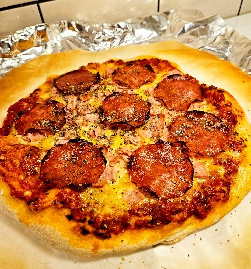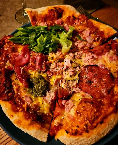Hemkokt tomatsås, skinka, mozarellaost, lite ostbrickeostkanter, lufttorkad skinka, salami och pesto.