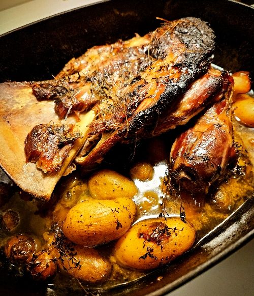 Kvällens middag hade vi påbörjat redan under fredagkvällen då vi putsade en lammbog och satte i en marinad av honung, senap, olivolja, timjan, salt och peppar.