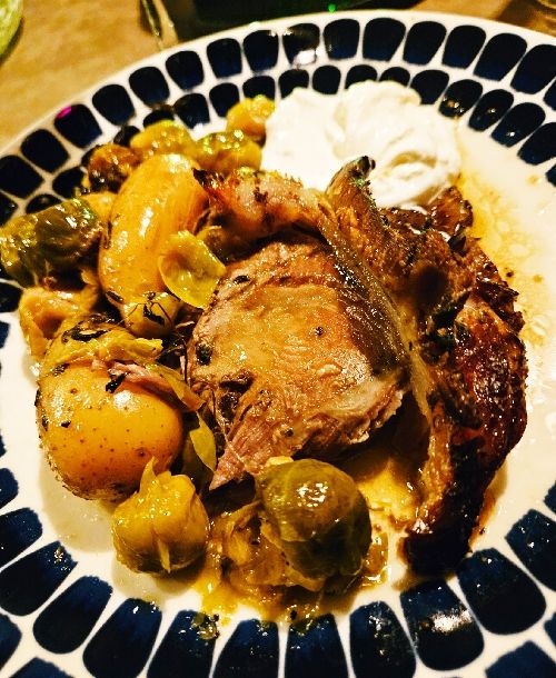 Vid femtiden åkte den in i ugnen tillsammans med potatis och brysselkål och mera timjan.