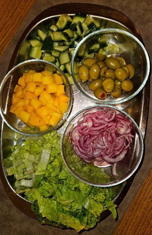 Och sen picklad rödlök, mango, grönsaker och en yoghurtdressing med vitlök, citron, honung och sriracha.