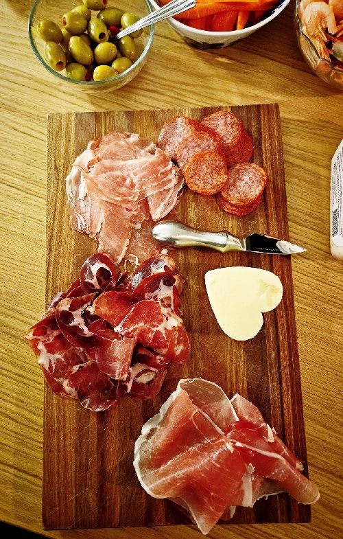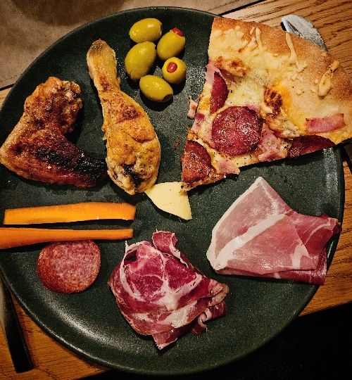 Kallskuret. Ost. Kycklingben och dito hotwings. Pizzaslice. Och (inte på bild) oskalade räkor.