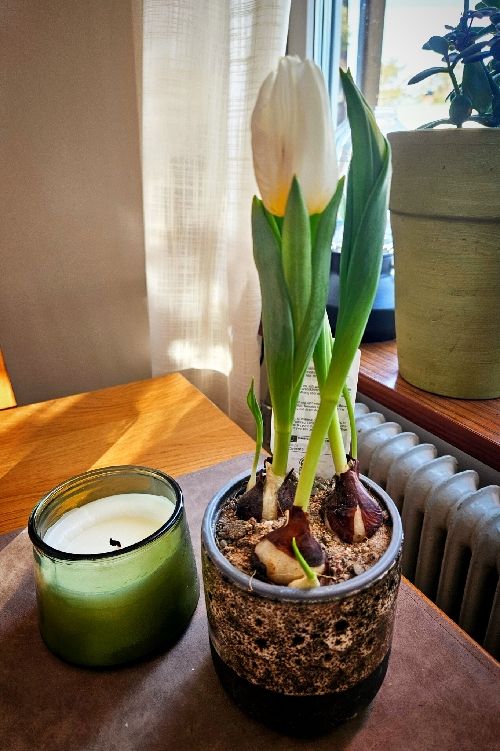 Riktigt töväder. Förmiddagen var varm. Men på min lunchpromenad kom regnet. Duktigt blöt efter 45 minuters knatade (passade på att köpa tullisar i kruka)