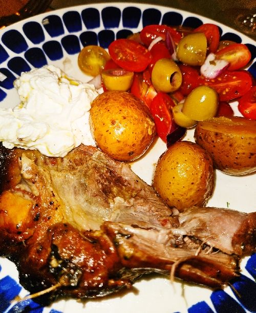 Sen lammbog, kryddad med senap, honung och timjan. Och potatisen tillagad i samma gryta.