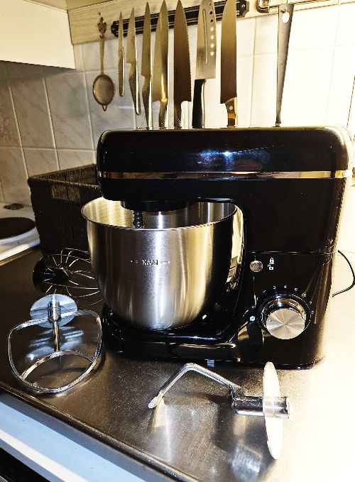 Den ska agera komplement till trotjönaren Kenwood från 70-talet. Den är ju stationerad i Gula Huset, och det är ju där jag, oftast, bakar. Men det händer, nån gång, att det ska göras en deg även på hemmaplan. Typ om en pizzadeg ska vara färdigt kalljäst till fredagkväll. Eller om jag fått för mig att baka ett bröd inför helgen. Eller när degen till morgonpepparkakorna ska hinna ligga till sig ett par dygn. Såna gånger har jag fårt göra degen förhand. Nu har jag en assistent även hemma.