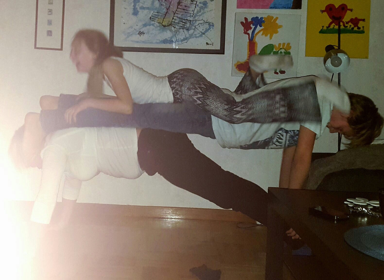 Yoga… eller nåt som ska föreställa det just nämnda… försigår just nu i vardagsrummet i Lilla Gula Huset: