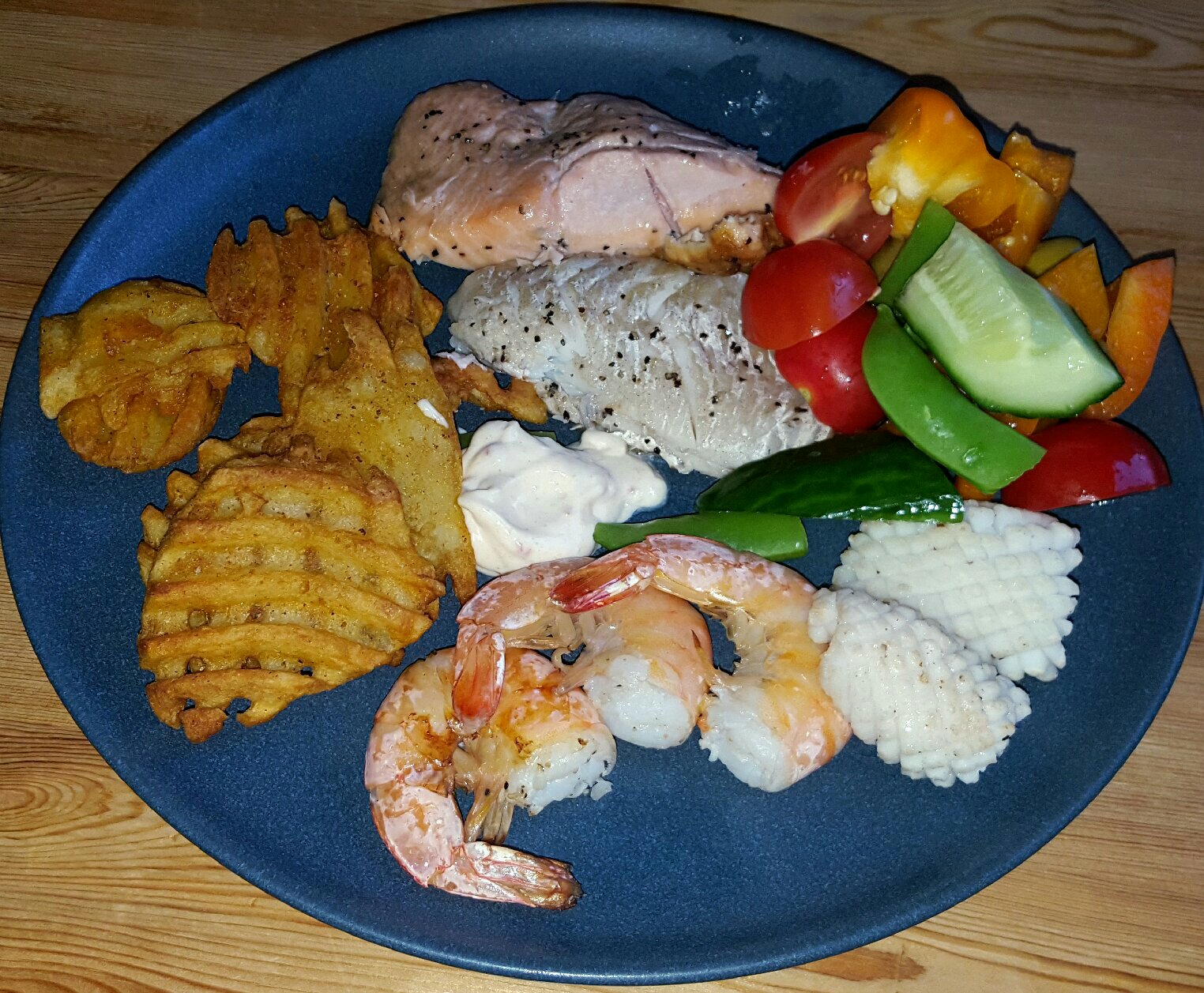 Grillad Torskrygg, Lax, Scampi och Bläckfisk.