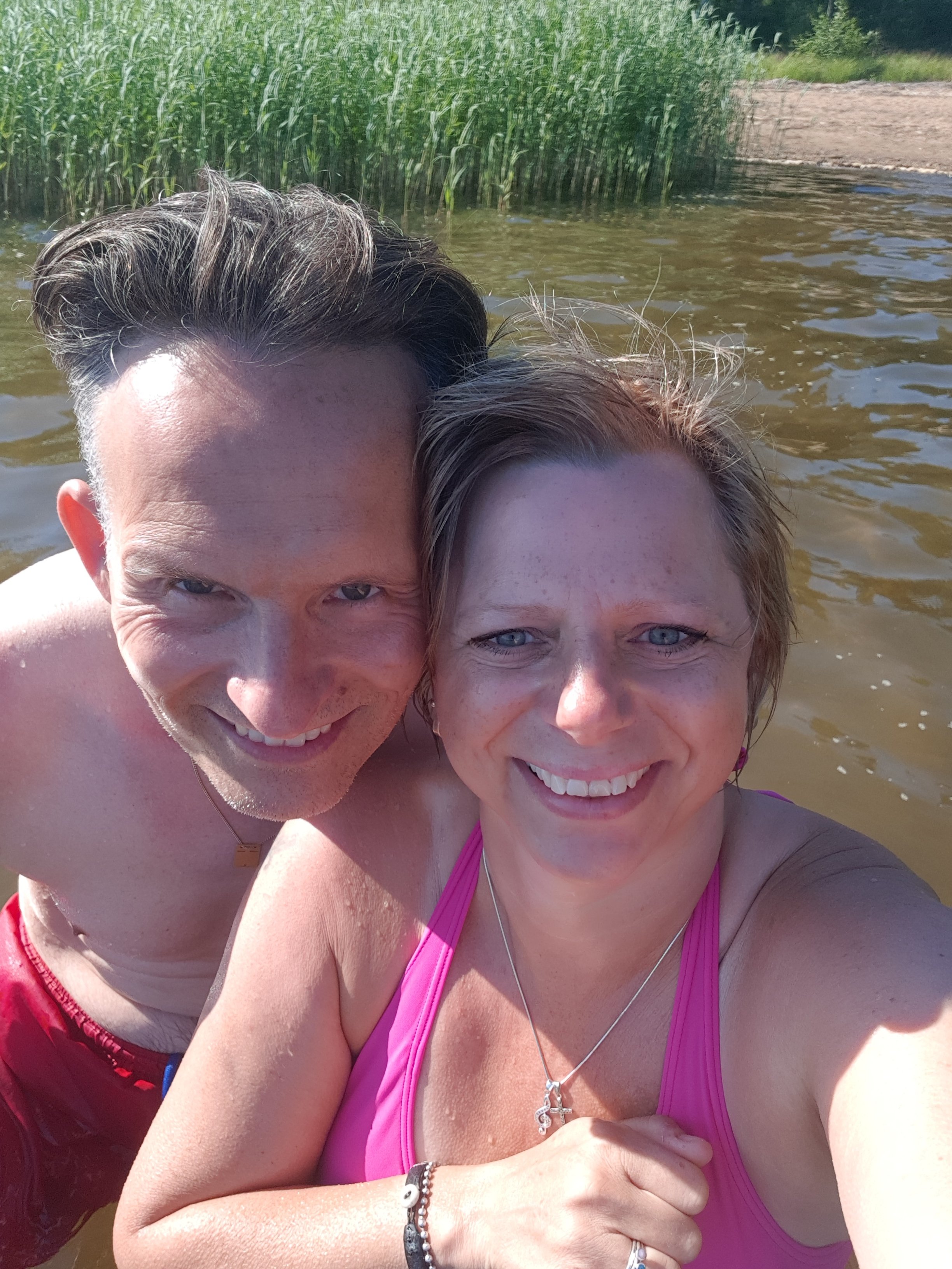 Fjortisen och jag gillade badtempen. Maken badade pliktskyldigt.,