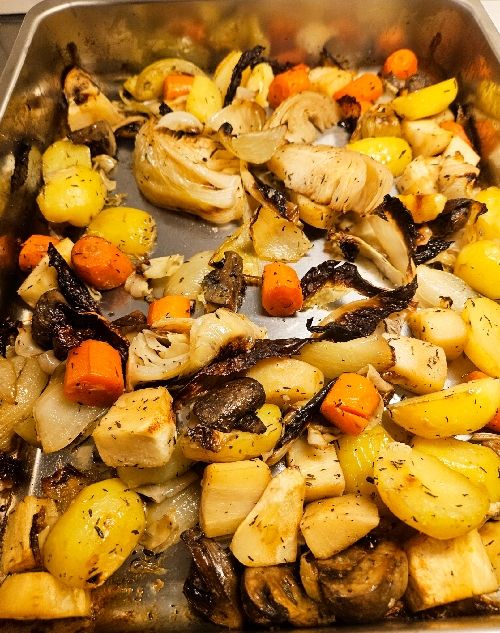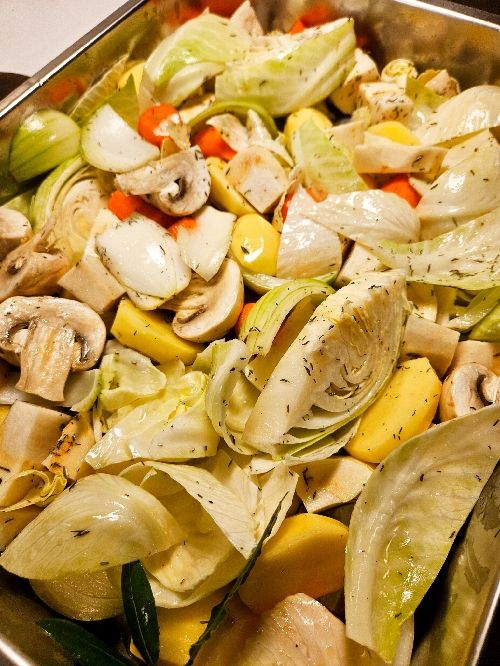 Dela potatis och de rotsaker som ska användas i bitar (vi hade lök, morot, palsternacka, färskt vitkål och champinjoner) Lägg i ugnsform. Rör runt i lite olivolja, salta och krydda med timjan. Häll i lite vin och vatten i formen.