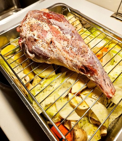 Lägg lammateken på ett galler över grönsakena.