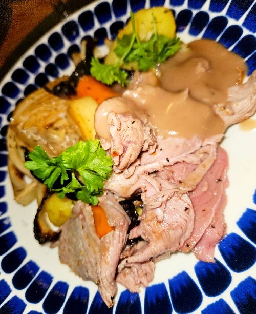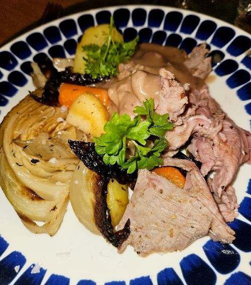Stek i nedre delen av ugnen. Först ca 30 minuter i 225⁰ och därefter i ca 170⁰ till innertempen är 60⁰. Vi hade denna gång en väldigt liten lammstek, så det tog bara ca en timme att uppnå rätt innertemp. En större stek tar ju längre tid.