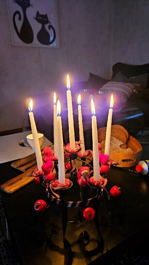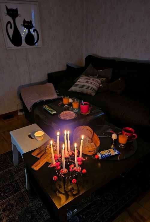 Flyttade om lite bord och pallar för att kunna duka upp till Luciafrukost till Luciamorgon på TV.