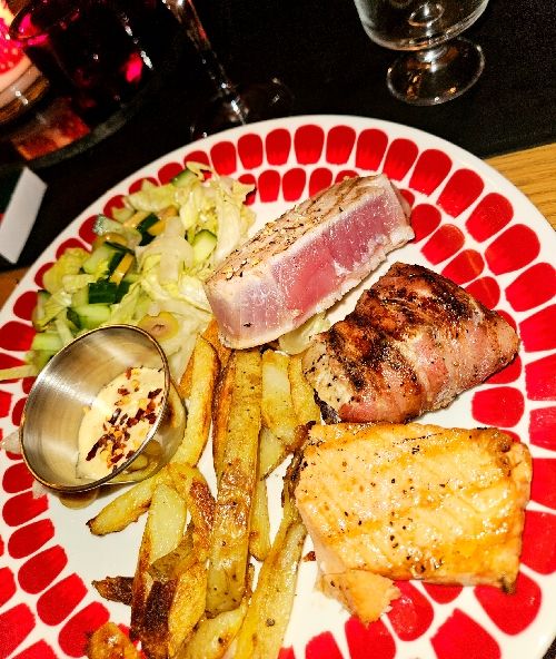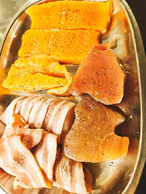 Baconlindad torsk, lax och tonfisk skulle på grillen.
