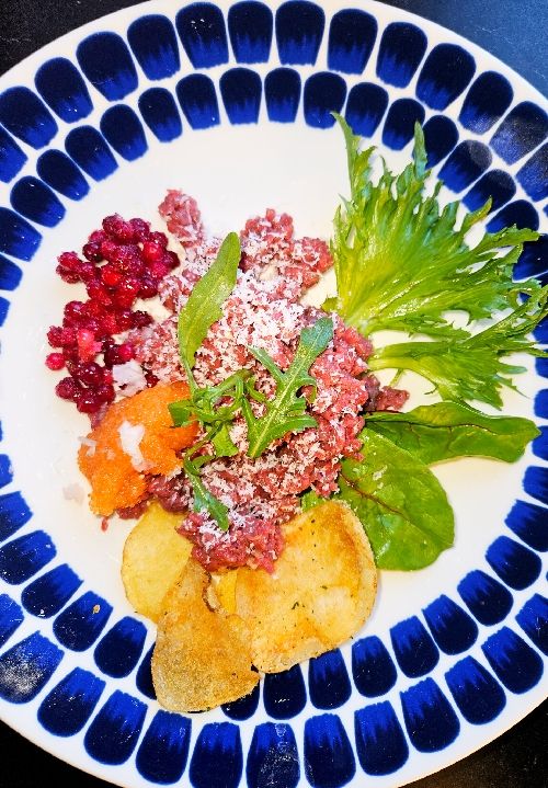 Montera sen med några salladsblad i botten. Sen köttet. Riv ost över. Klicka upp lingon och löjrom. Toppa rommen med ytterligare lite chalottenlök. Lägg några lantchips på sidan om.