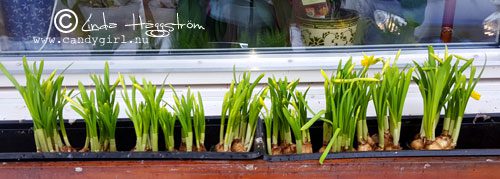 Jag slängde även ut påskliljorna. Nio stycken under köksfönstret och nio under ungens: