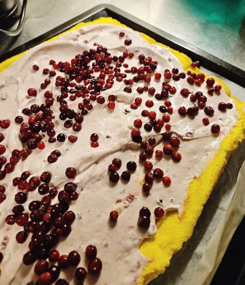 Och sen gjorde jag en frosting av philadelpia, vispad grädde och florsocker. Den smaksatte jag sen med lingonsåsen (sylten?) från kalkonmiddagen; den med apelsin, farinsocker och kanel. Och så strödde jag över lingon, bara rena.