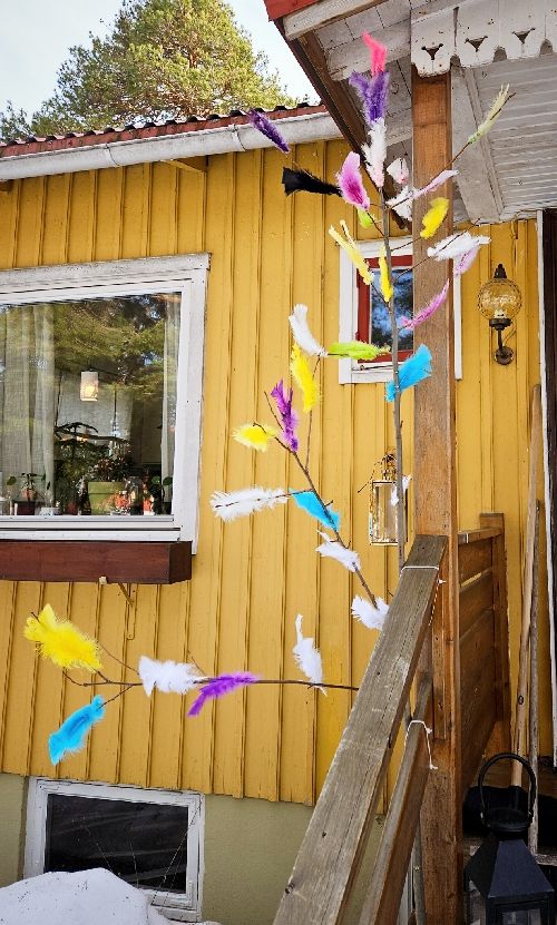 Stannade kvar ute. Fixade ett ”påskträd”, plockade ris, försökte elda sistnämda – men det brann dåligt. Och plockade in ljusslingorna.